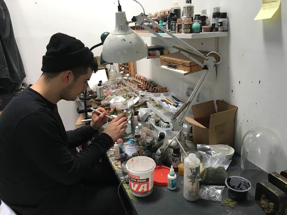 Jacob explains that he starts most days absorbed in these microworlds, beginning by either sculpting or priming his pieces. “Because my work is so small I need to let my eyes become completely focused before I start painting the finer details.” Once the pieces have been primed he then starts layering the models with different washes of colour and then drybrushes the scenes to add texture. For the final stage is he adds foliage and painted figures to set the scene and create the desired atmosphere.